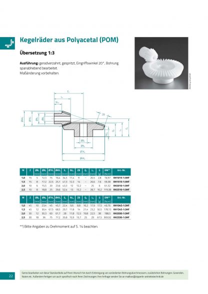 Ausführung: geradverzahnt, gespritzt, Eingriffswinkel 20°, Bohrung spanabhebend bearbeitet.